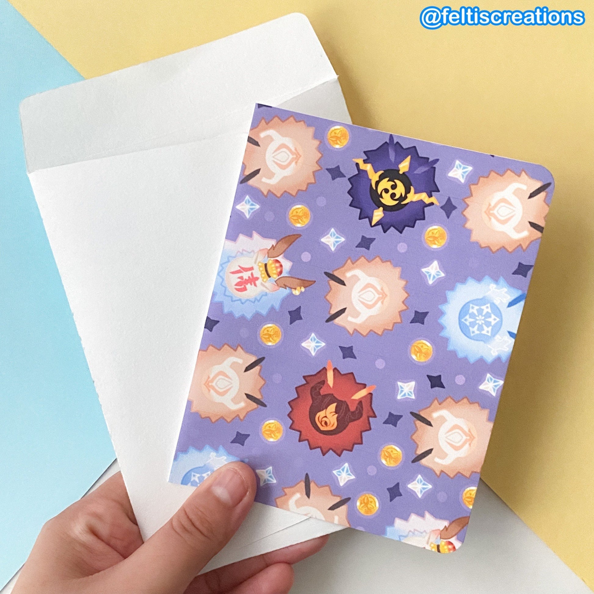 Want to spice up a gift for someone who loves video games? No worries! These Genshin Impact-inspired Greeting Cards are perfect for a Genshin themed gift or just as a nice small note where they can display in their rooms! They are blank inside for you to write whatever you desire but you can also request for me to print in a message for you if you don't like your handwriting. These designs are completely made by me digitally as well as the item itself is made in the comfort of my home!